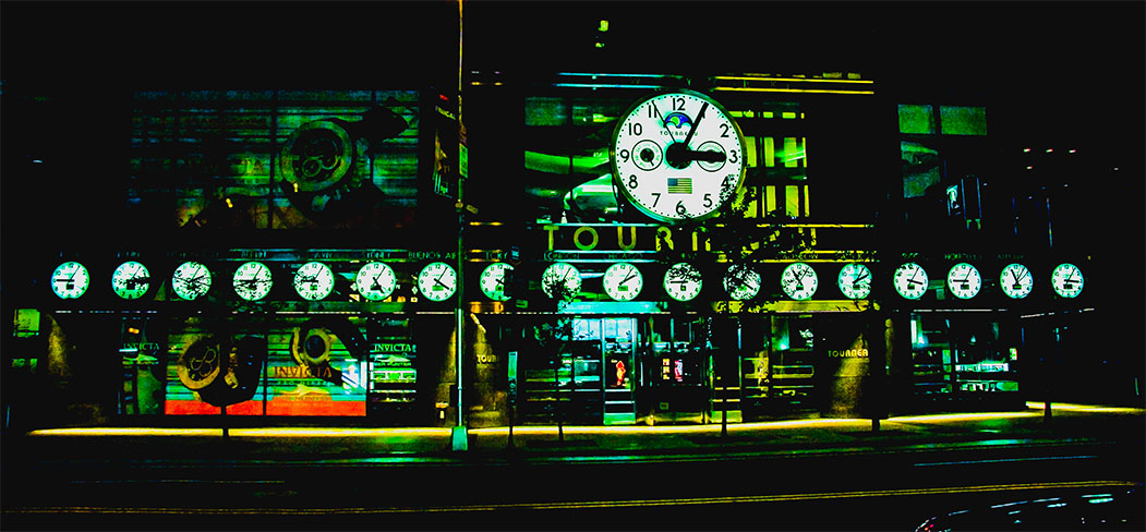 The Tourneau watch showroom at night located at Madison and 57th Ave.with all the time zones displayed.