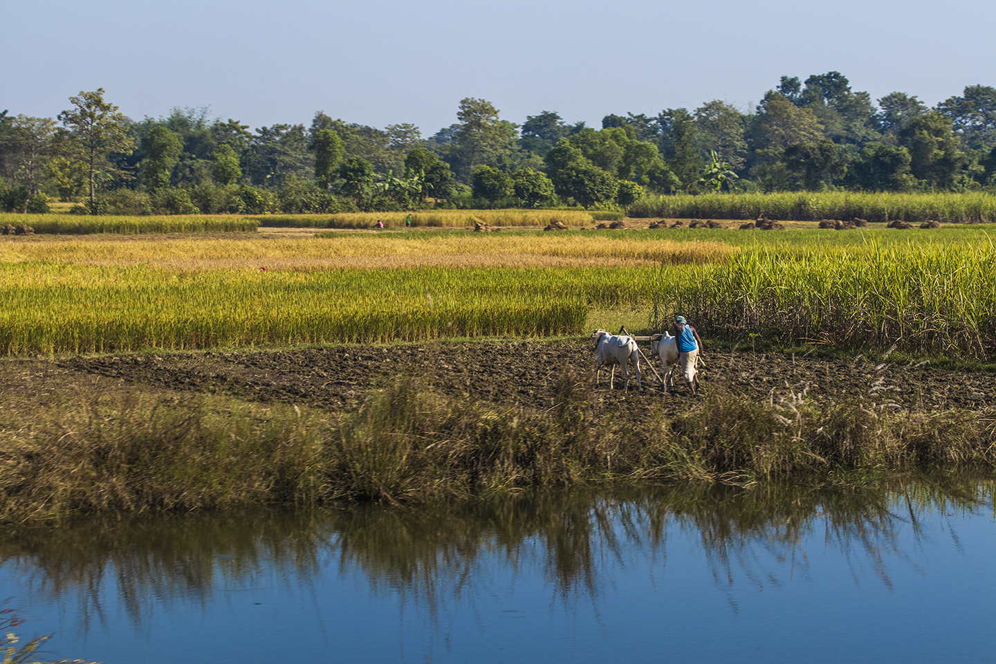 A view from a train window in south India – A farmer plowing the fields with oxen