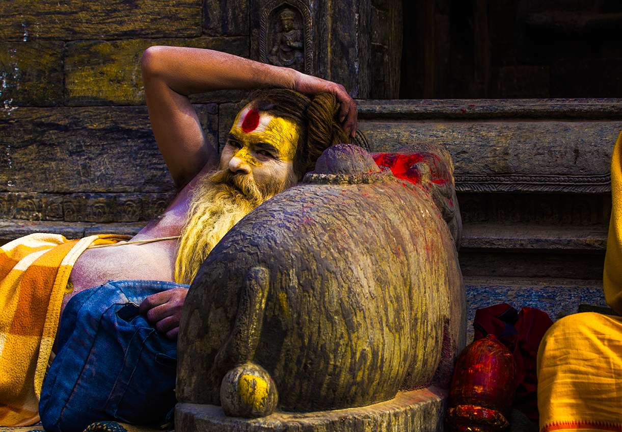 Katmandu,. Nepal a Sadu relaxing. by the famous Shiva temple- Pashupatinath Temple